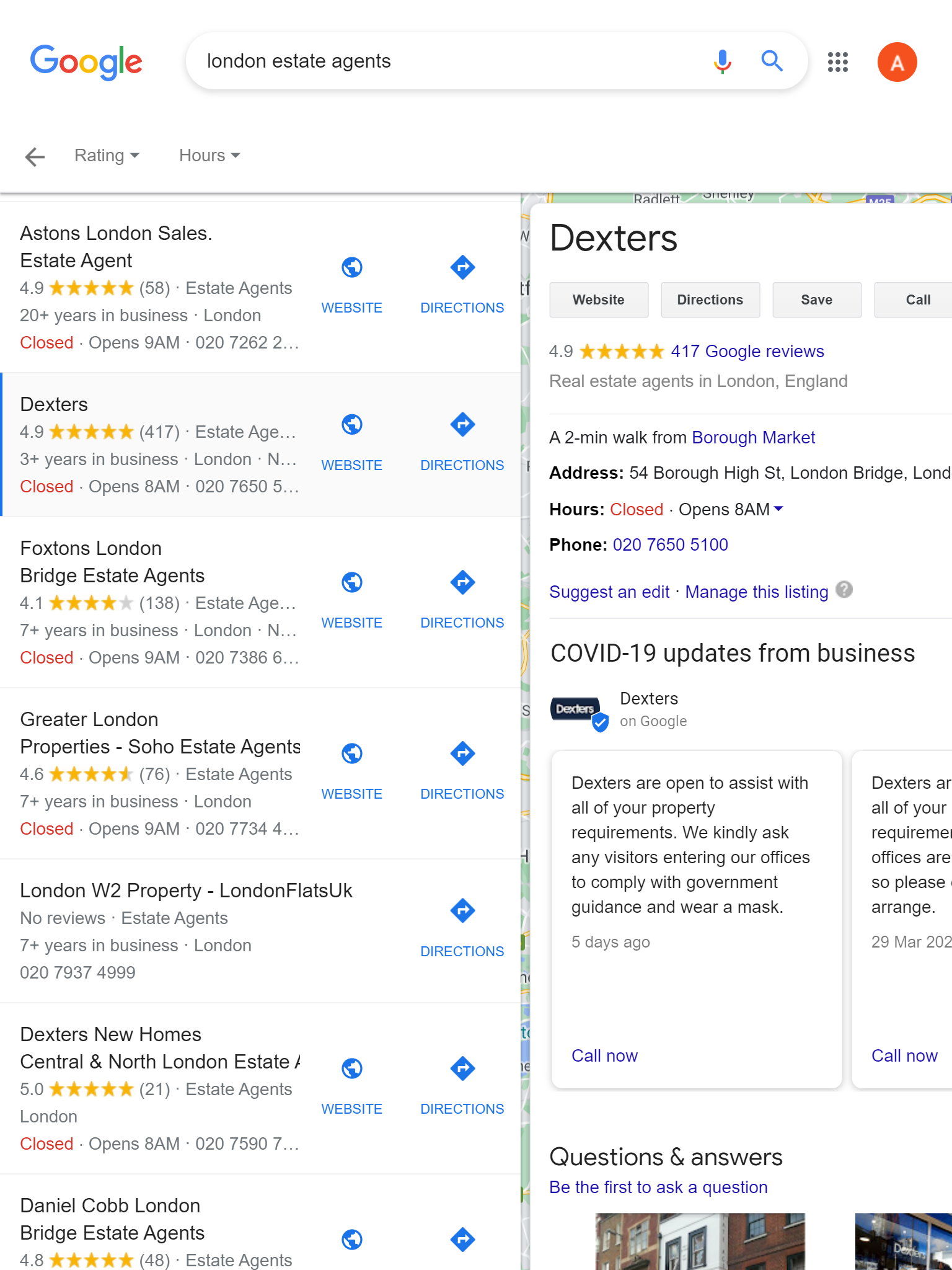Local SEO is the focus on improving an estate agency's search engine visibility for a local audience. This is done through the optimisation of maps listings and offices pages for localised keyword searches, such as ‘London estate agents’, ‘estate agent in my area’ or even ‘estate agents near me’.